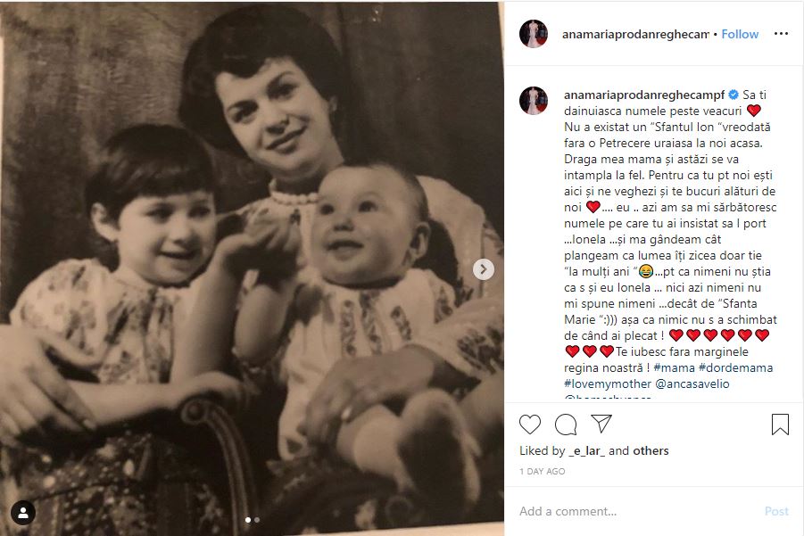„Să ți dăinuiască numele peste veacuri ❤️ Nu a existat un “Sfântul Ion “vreodată fără o Petrecere uraiasa la noi acasă. Dragă mea mama și astăzi se va întâmplă la fel. Pentru că tu pt noi ești aici și ne veghezi și te bucuri alături de noi ❤️…. eu .. azi am să mi sărbătoresc numele pe care tu ai insistat să l port …Ionela …și mă gândeam cât plângeam că lumea îți zicea doar ție “la mulți ani “?…pt că nimeni nu știa că s și eu Ionela … nici azi nimeni nu mi spune nimeni …decât de “Sfânta Marie “:))) așa că nimic nu s a schimbat de când ai plecat ! ❤️❤️❤️❤️❤️❤️❤️❤️❤️Te iubesc fără marginele regina noastră ! #mama #dordemama #lovemymother @ancasavelio @homesbyanca”, este mesajul postat de Anamaria Prodan pe reațeau socială.