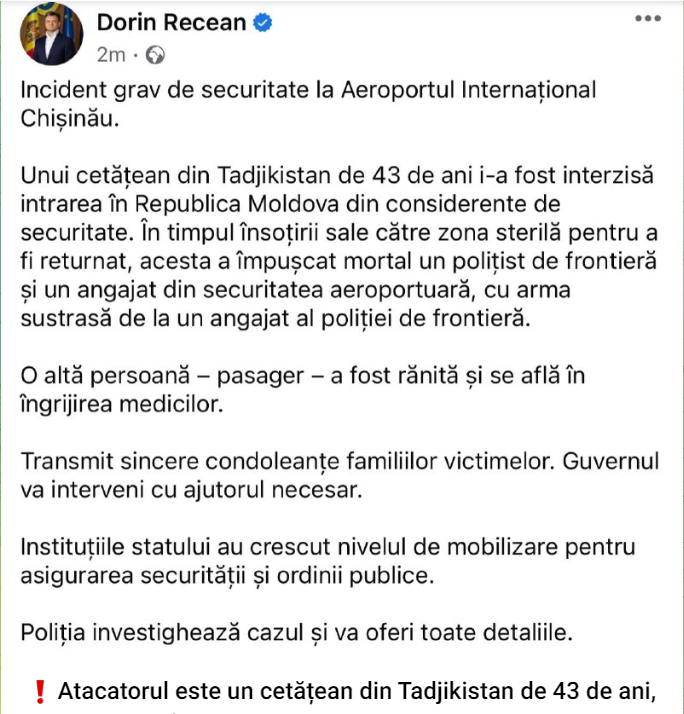 „Este vorba despre cetățean din Tadjikistan de 43 de ani, căruia i-a fost interzisă intrarea în Republica Moldova din considerente de securitate. În timpul însoțirii sale către zona sterilă pentru a fi returnat, acesta a împușcat mortal un polițist de frontieră și un angajat din securitatea aeroportuară, cu arma sustrasă de la un angajat al poliției de frontieră„, a precizat Recean într-o postare pe Telegram.