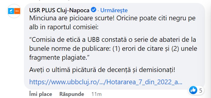 USR a reacționat la aflarea rezultatului prezentat de UBB
