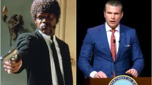 În timpul unei slujbe religioase la Pentagon, Hegseth a recitat un presupus verset biblic care, de fapt, face referire la o scenă celebră din filmul Pulp Fiction, în care a recitat versetul biblic inexistent pe care Samuel L. Jackson îl rostește în Pulp Fiction, citându-l aproape cuvânt cu cuvânt.