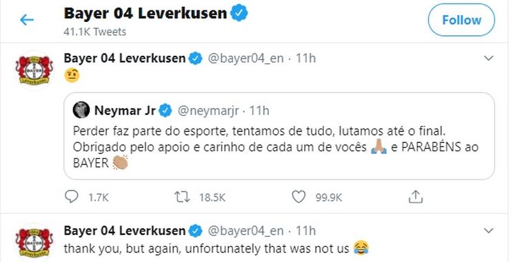 Neymar a postat pe rețelele de socializare un mesaj de felicitare la adresa noii campioane a Europei, însă din numele câștigătoarei a omis ultima literă, astfel că în loc de Bayern, a felicitat-o pe … Bayer Leverkusen.