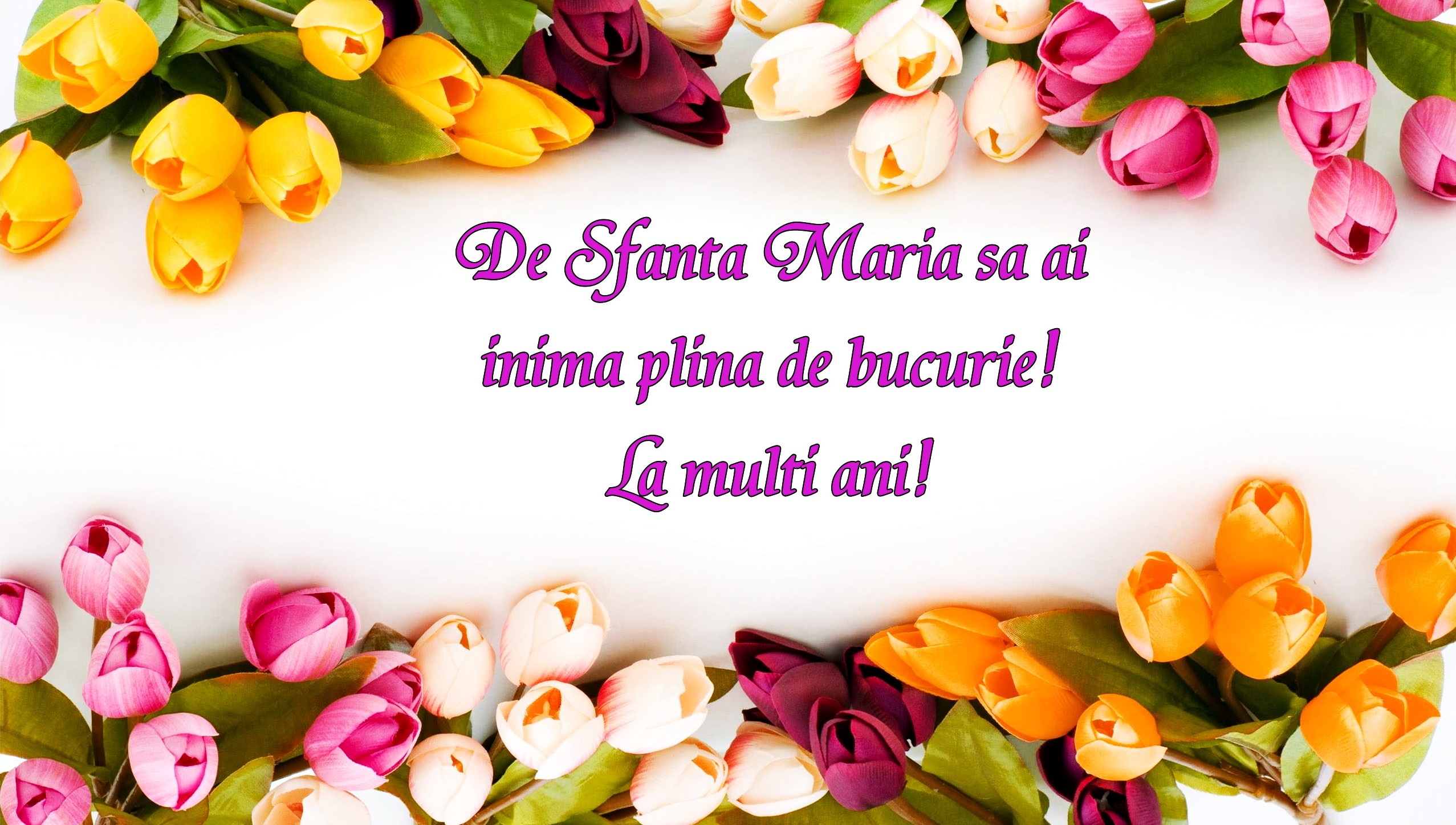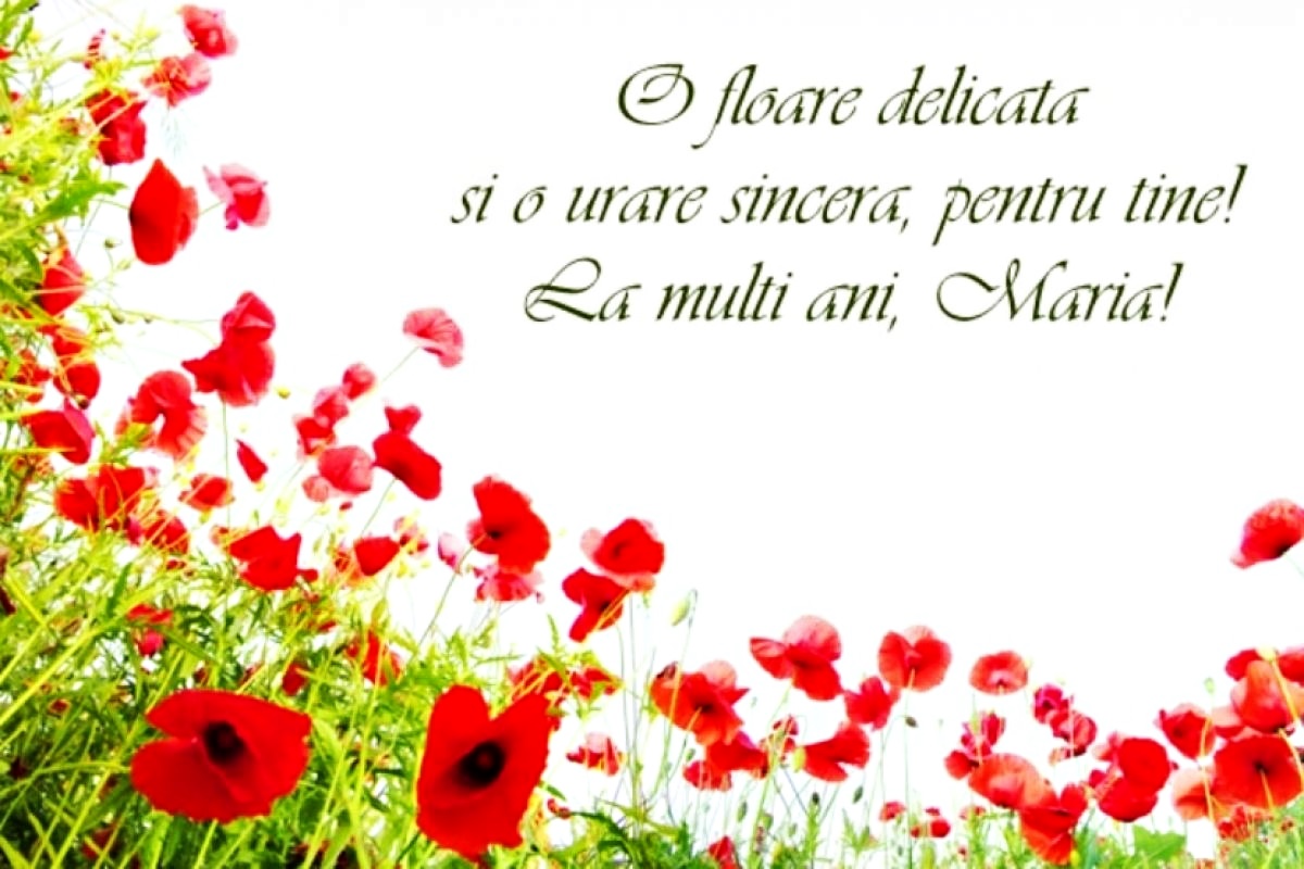 2. De ziua numelui tău, îţi doresc tot binele din lume, noroc, fericire și sănătate şi să ţi se îndeplinească toate dorinţele. La mulţi ani, Maria!