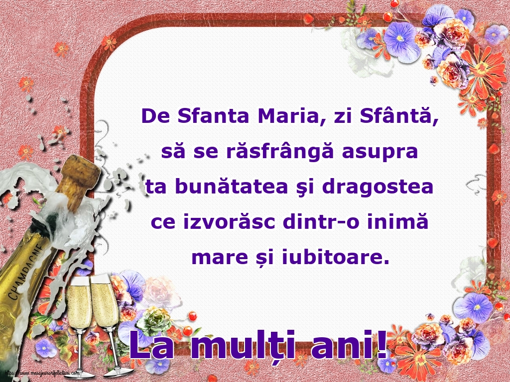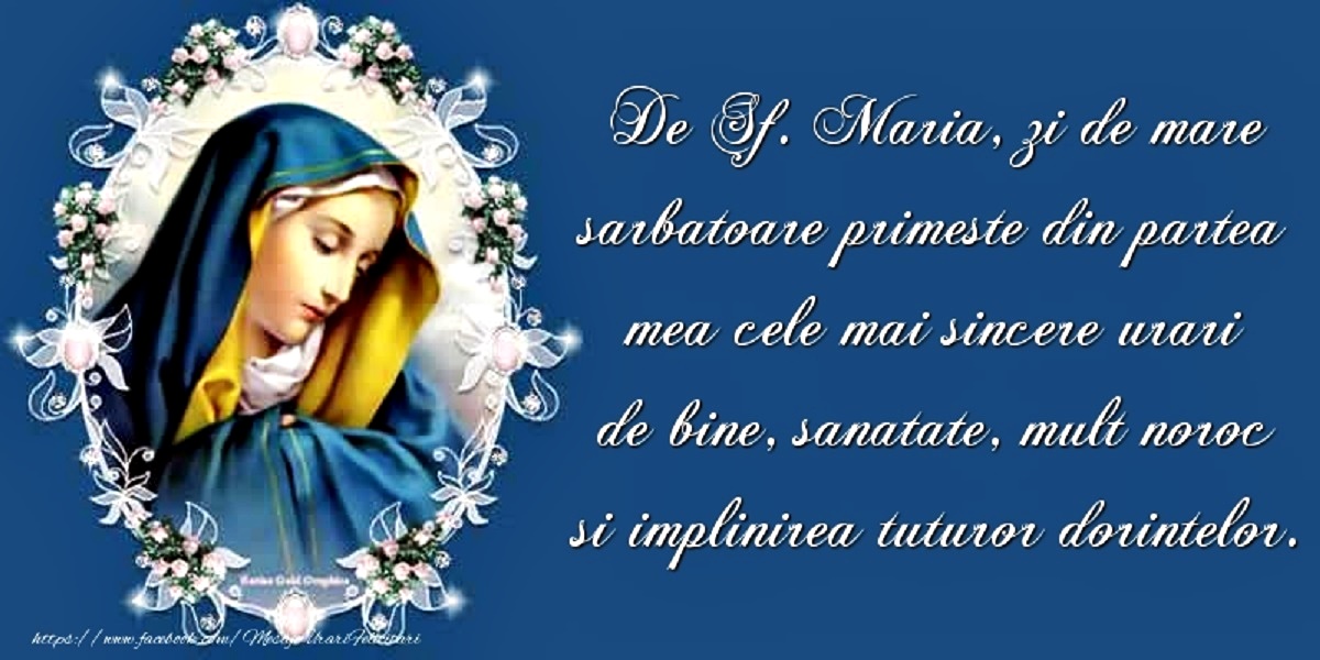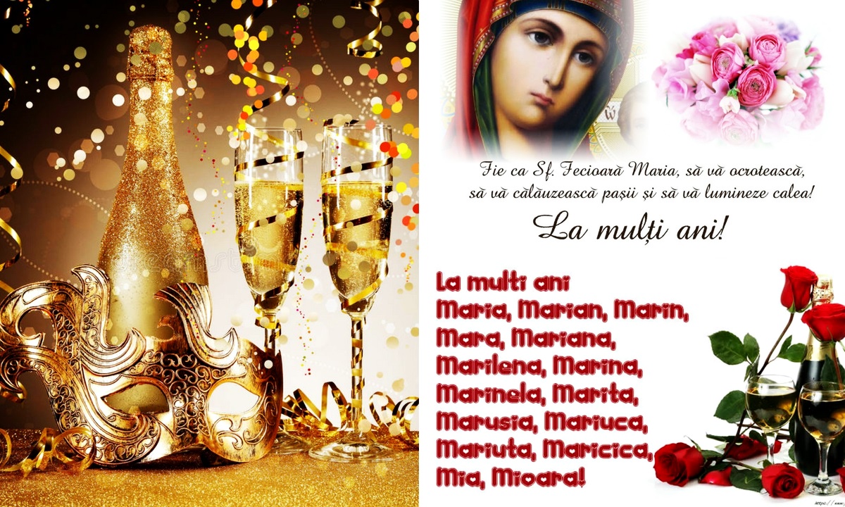 6. În această zi specială îţi transmit cele mai sincere urări. Să ai o viaţa plină de lucruri bune, iar Sfânta Maria, al cărei nume îl porţi, să te ocrotească mereu. La mulţi ani de ziua numelui tău!