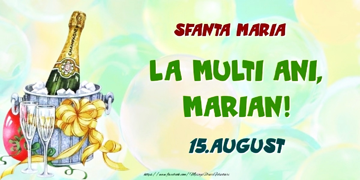 Nu știi ce urări să le transmiți celor care poartă numele Sfintei Fecioare Maria sau derivate din acesta și care își serbează onomastica pe data de 15 august? Nicio problemă! Am pregătit pentru tine o selecție de urări, mesaje și SMS-uri, alături de câteva felicitări, pe care le poți trimite tuturor celor ce poartă numele de Maria, Marinela, Mărioara, Mariana, Marilena, Măriuca, Marian, Marinel, Marinică.