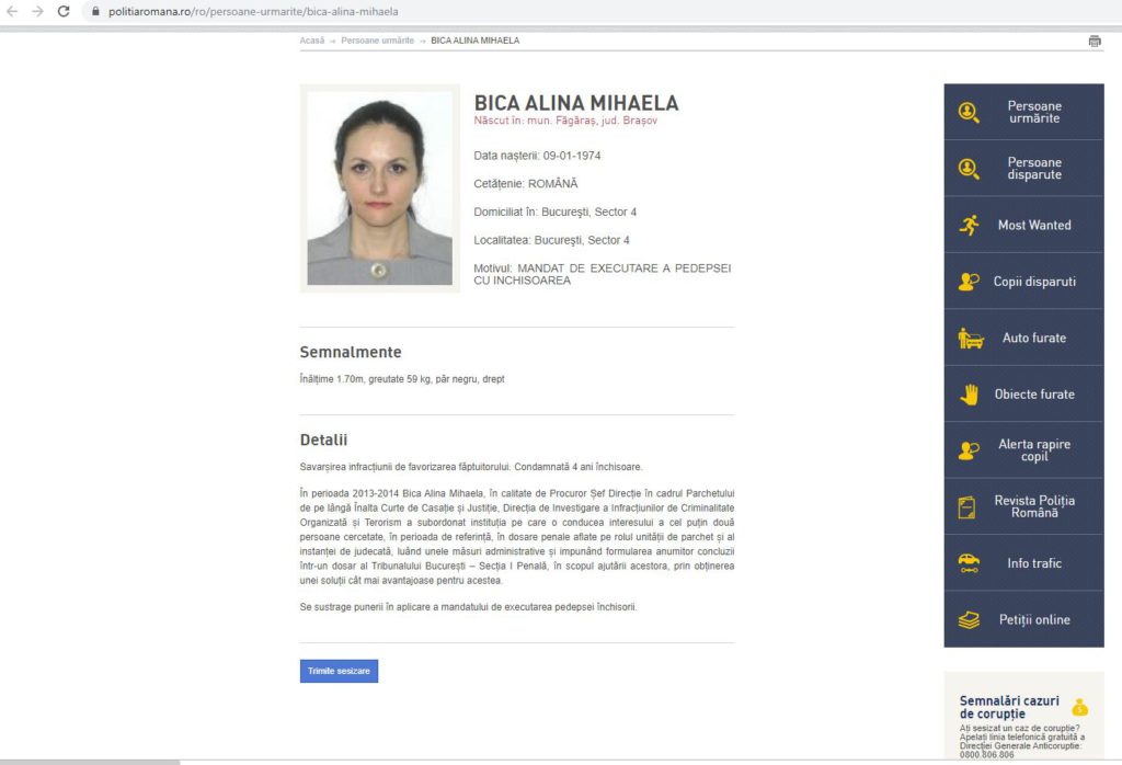 Alina Bica a fost condamnată la patru ani de închisoare cu executare într-un dosar de favorizare a făptuitorului, după ce procesul s-a reluat de la zero, în urma contestației cu privire la constituirea completului de cinci judecători. Decizia magistraților este una definitivă. Bica se sustrage punerii în aplicare a mandatului de executarea pedepsei închisorii.
