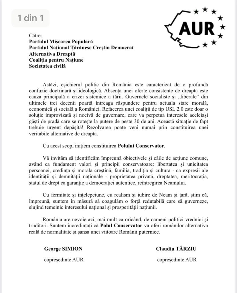 Liderul AUR a transmis pentru impact.ro un document prin care ambii lideri ai partidului își asumă coagularea partidelor conservatoare și PMP se află pe lista partidelor invitate să ia parte la această inițiativă. Discuțiile despre formarea unei astfel de colaborări au început încă din noiembrie 2021.