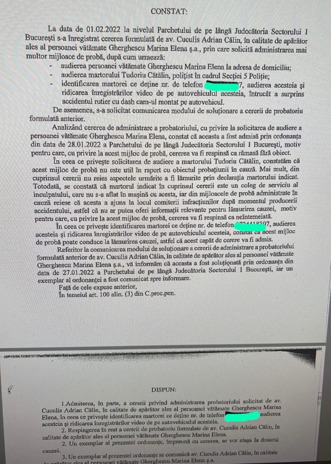 Martora care ar avea filmările accidentului pe camera de bord, audiată azi. Polițistul care a schimbat geaca de la uniformă cu inculpatul în cazul Raisa nu va fi audiat
