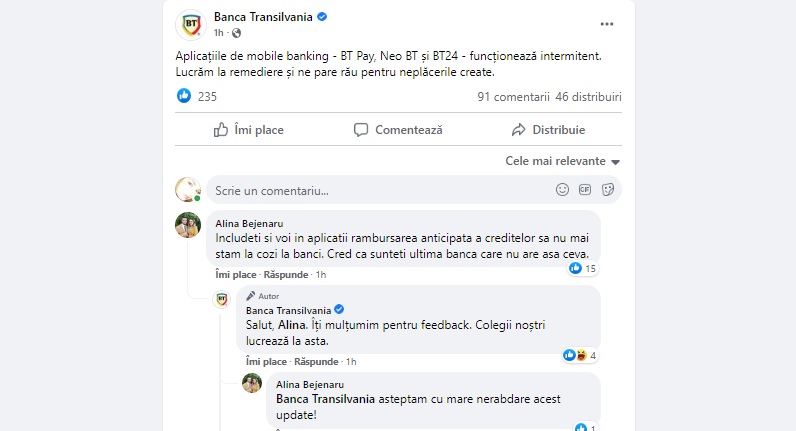 Mesajul afișat de Banca Transilvania în această dimineață. Clienții nu au ce să facă