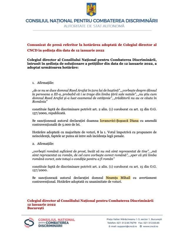 „Mai jos aveți comunicatul Consiliului Combaterii Discriminării privind amendarea d-nei Diana Șoșoacă și sancționarea d-lui Mihail Neamțu, în urma sesizării mele privind afirmațiile rasiste spuse de cele două personaje în spațiul public.