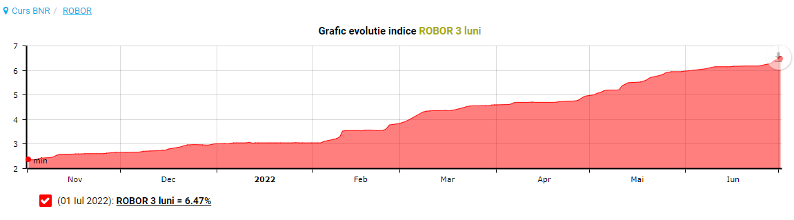Românii care au credite ipotecare sau de consum cu dobândă variabilă plătesc rate mai mari din iulie, după ce indicele ROBOR la trei luni a ajuns la 6,47%, iar indicele de referință pentru creditele consumatorilor (IRCC), în funcție de care se calculează dobânzile la creditele în lei luate după luna mai 2019, a fost actualizat la 2,65%, în creștere de la 1,86% în trimestrul precedent.