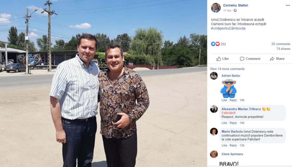 „Ionuț Dolănescu se întoarce acasă! Oamenii buni fac întodeauna echipă“, a scris pe Facebook, Corneliu Ștefan, liderul PSD Dâmbovița, și deputat în Parlamentul României.